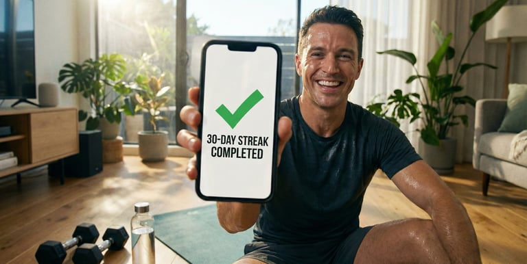 Power online challenges, home workout programs, or healthy habit systems emphasizing sustained momentum.